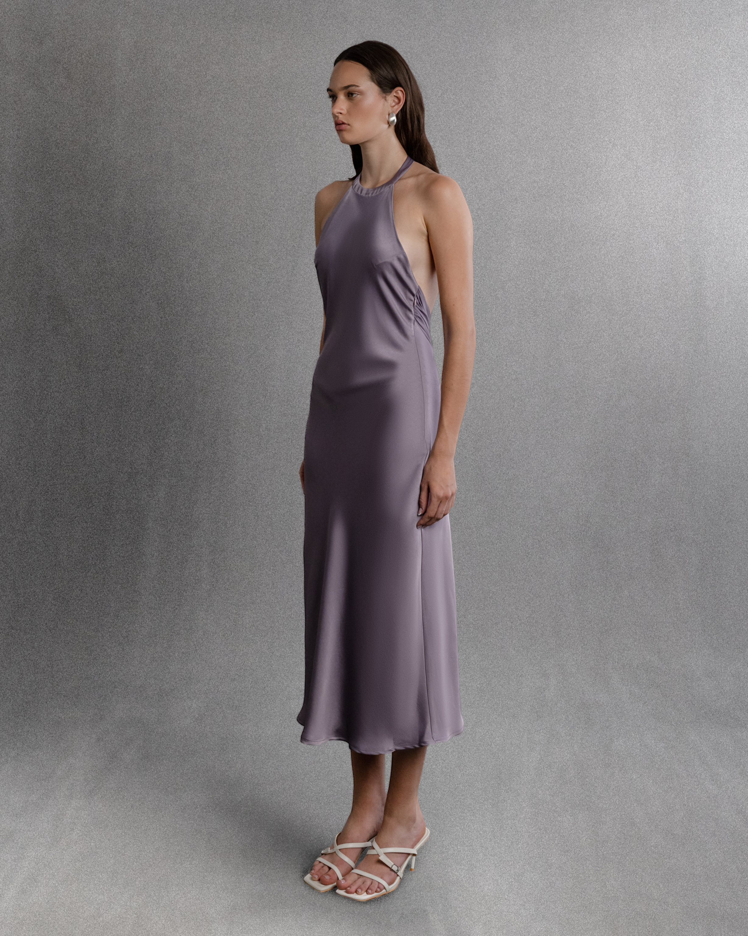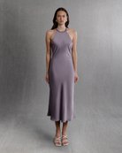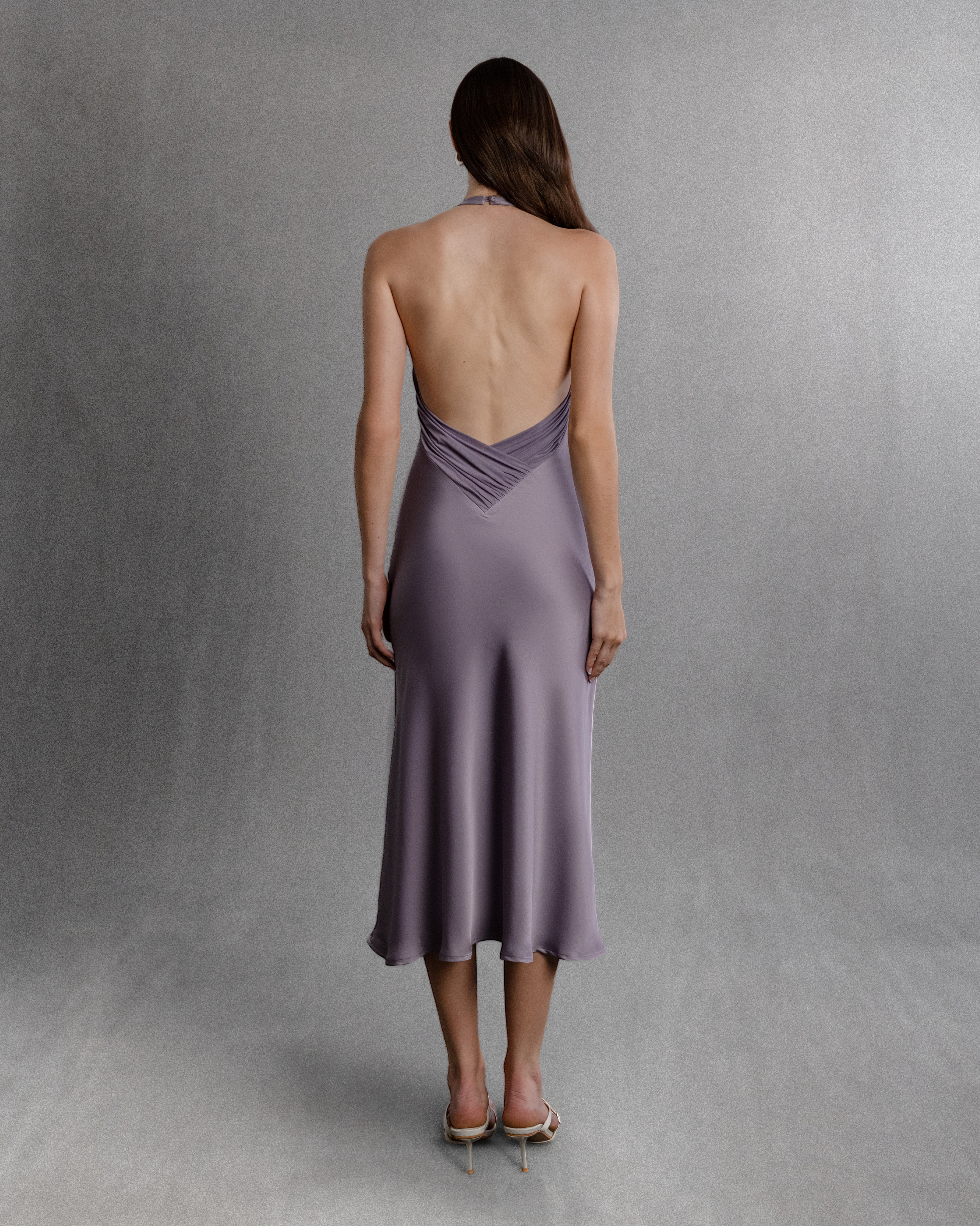This lilac halter dress combines elegance with modern charm. Designed with a high neckline and a softly flared hem, it gracefully follows the body’s shape for a sleek silhouette. The sleeveless cut adds a clean, contemporary edge that makes it perfect for both formal events and stylish evenings out.