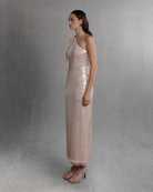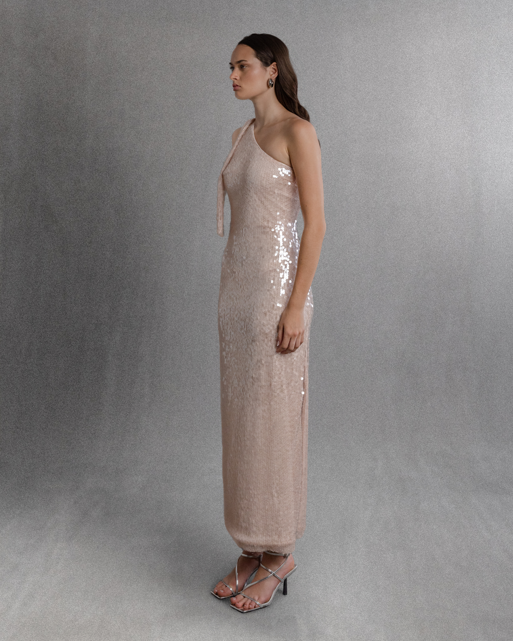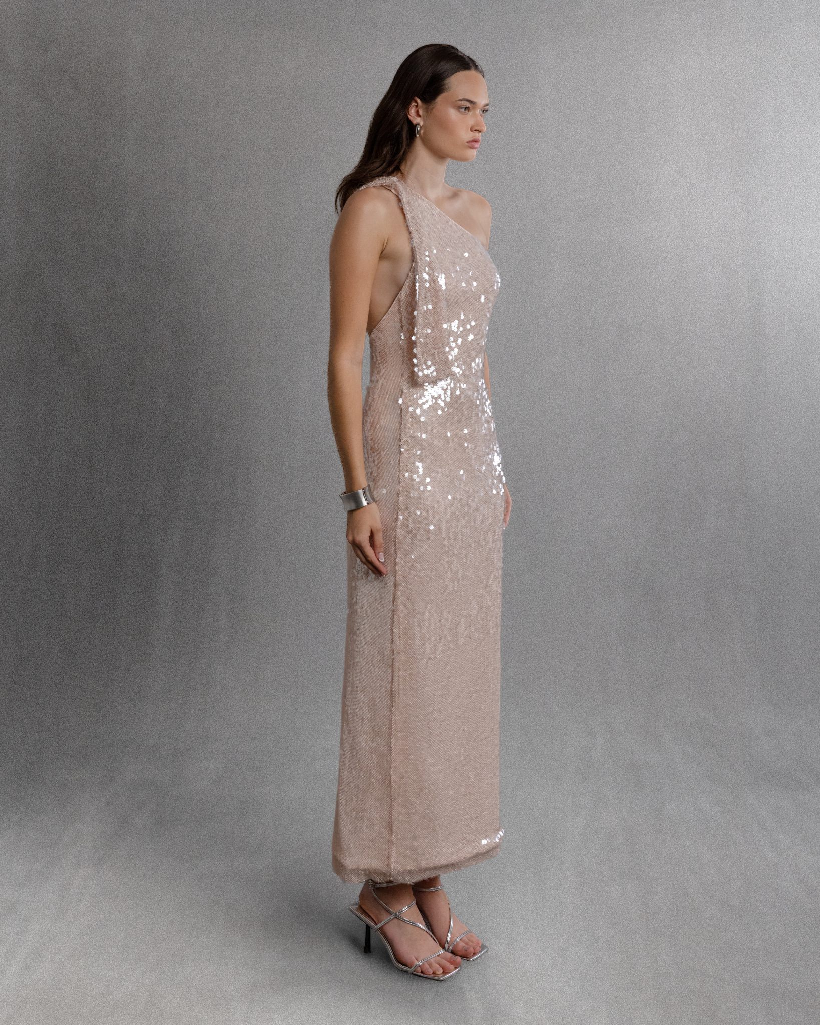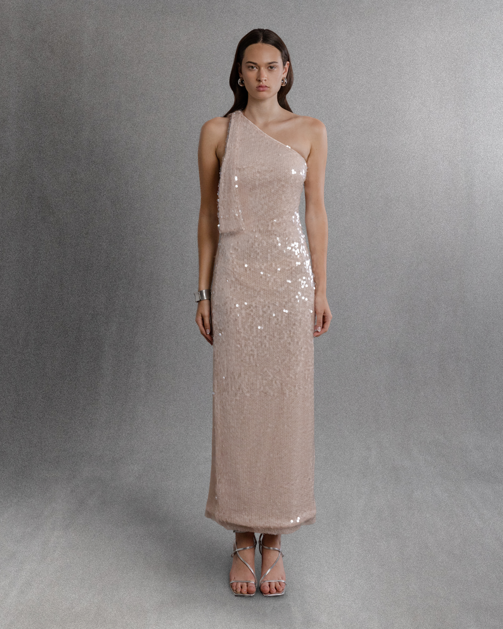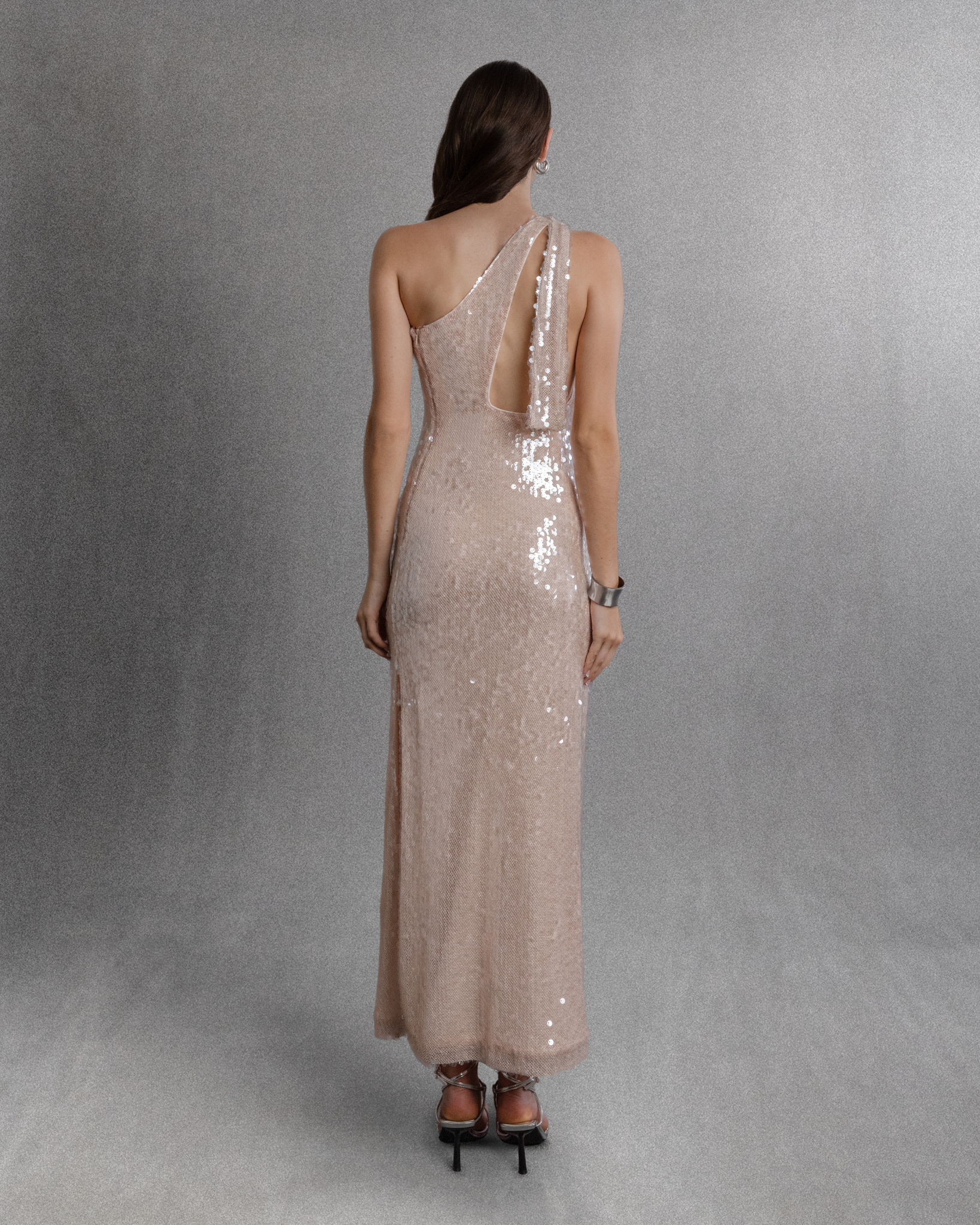 Step into soft glamour with this blush one-shoulder sequin maxi dress. The asymmetrical neckline adds an elegant twist to a classic silhouette, while the fully sequined body reflects light with every movement. Designed to sculpt the figure and flatter from every angle, it's a statement dress that remains effortlessly wearable.