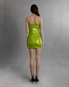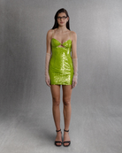 Bold and playful, this bright green mini dress features a structured bust with defined cup shaping and a daring front cutout. Fully covered in sparkling sequins, the fitted silhouette hugs the body while thin straps provide a barely-there look. Vibrant and daring, this dress is made for nightlife, special occasions, or anytime you want your outfit to speak for itself.