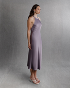 This lilac halter dress combines elegance with modern charm. Designed with a high neckline and a softly flared hem, it gracefully follows the body’s shape for a sleek silhouette. The sleeveless cut adds a clean, contemporary edge that makes it perfect for both formal events and stylish evenings out.