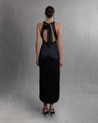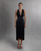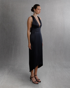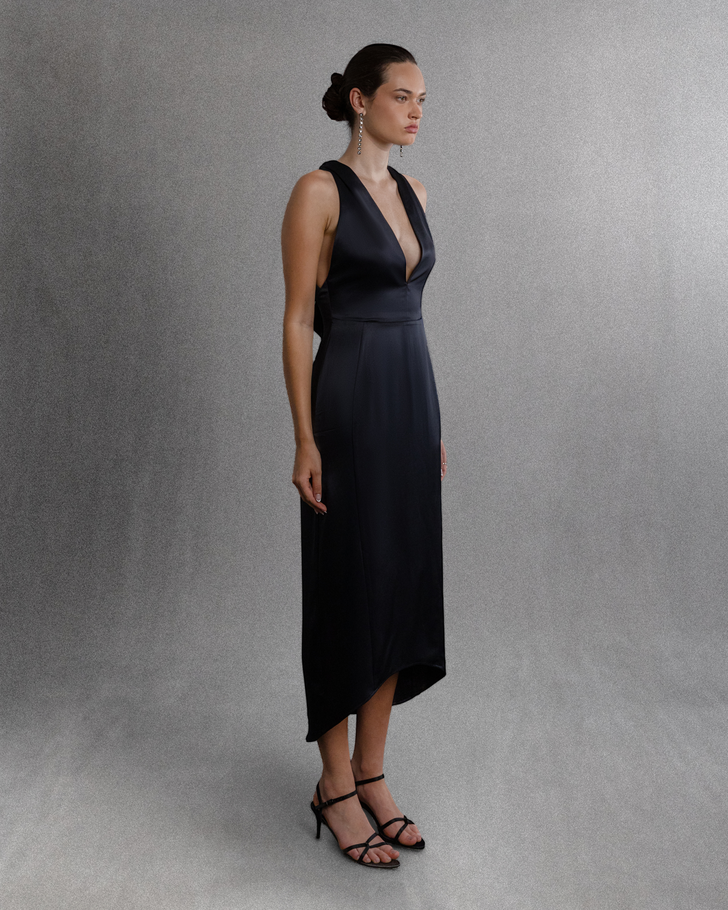 Elegant and refined, this midnight-hued satin dress features a structured silhouette with a plunging V-neckline and soft pleats at the shoulders. The deep tone and subtle sheen lend a timeless quality, while the midi-length hem makes it suitable for formal dinners, evening events, or modern cocktail settings. Its minimalist cut flatters the figure with clean, uninterrupted lines.