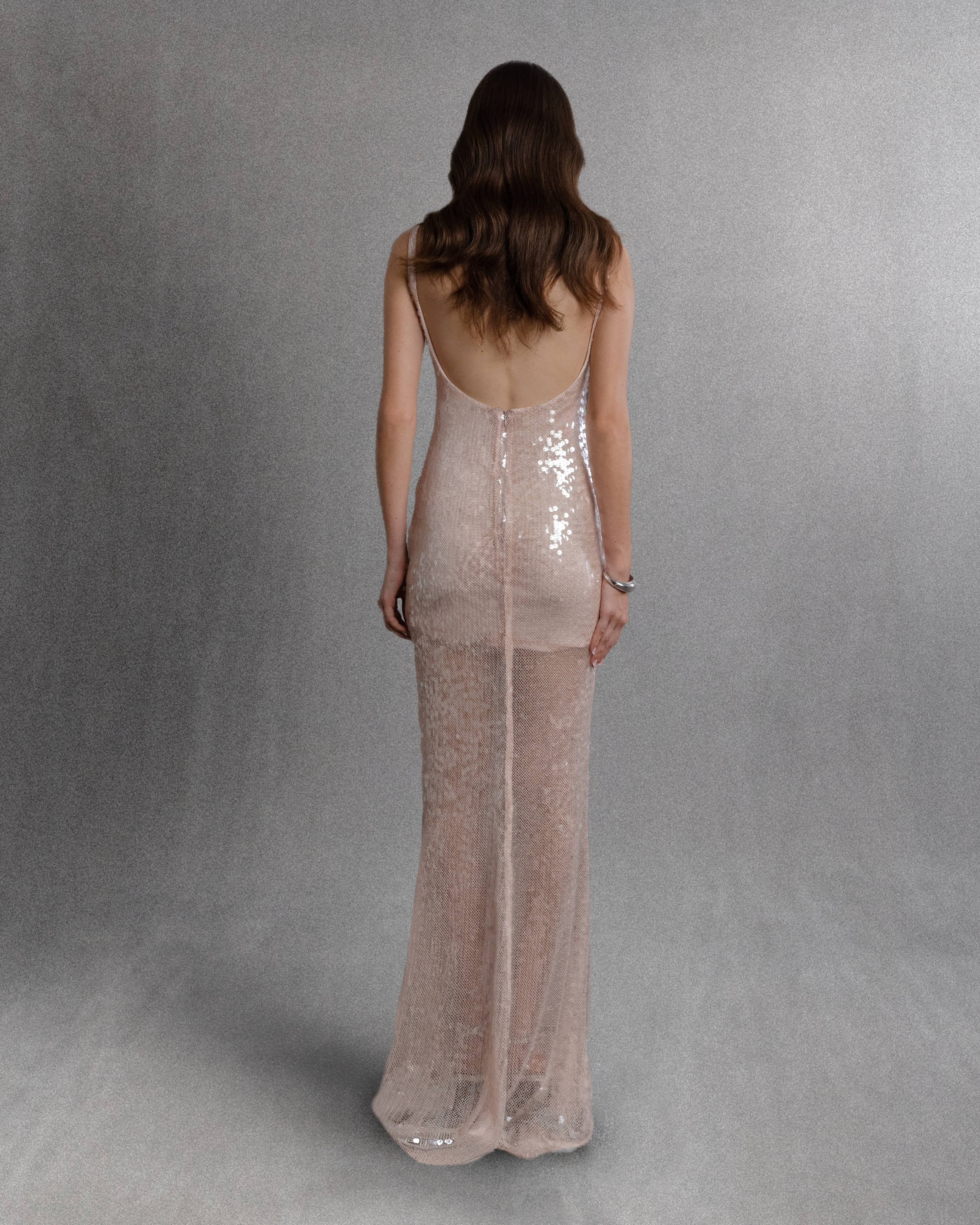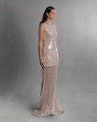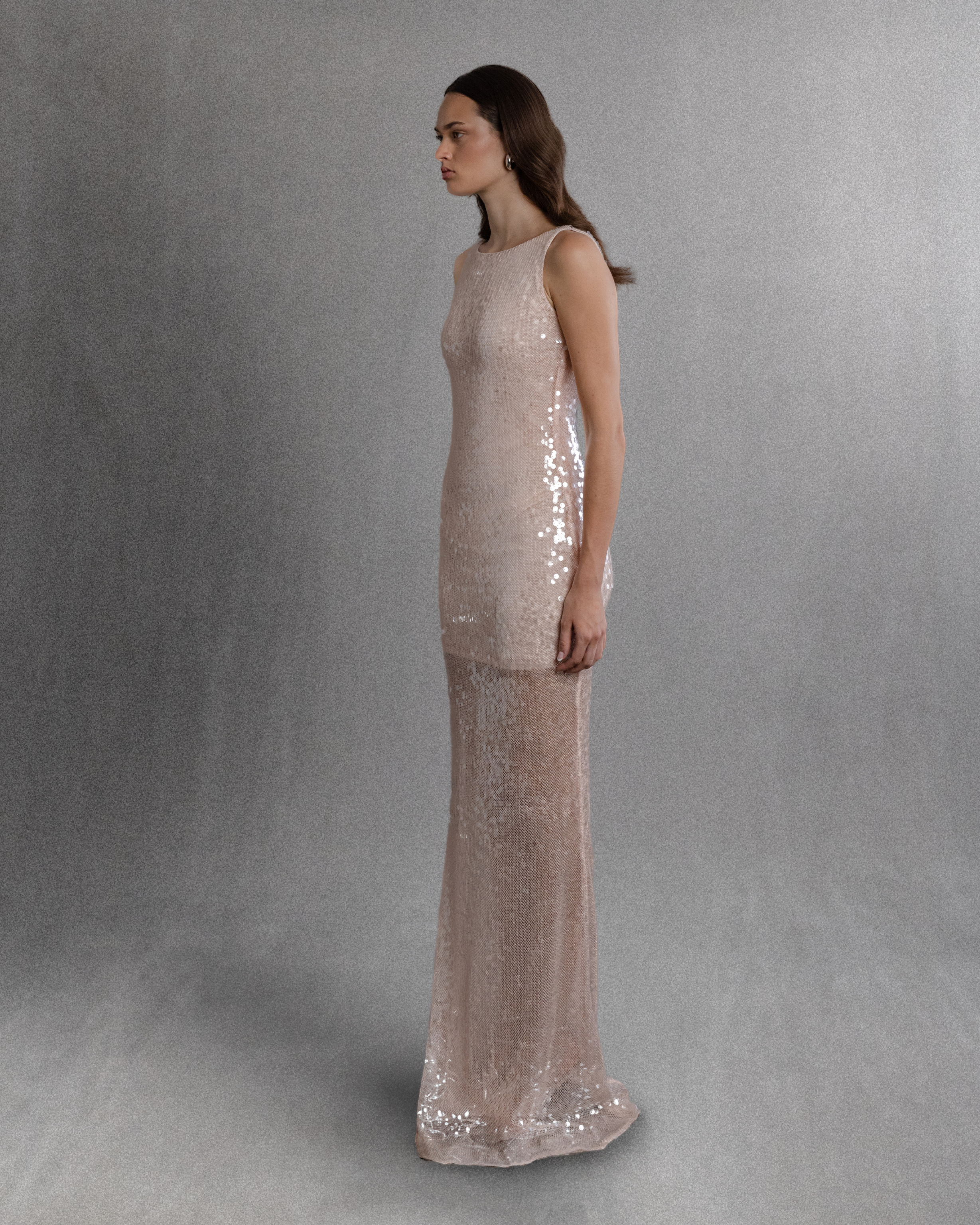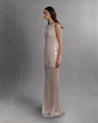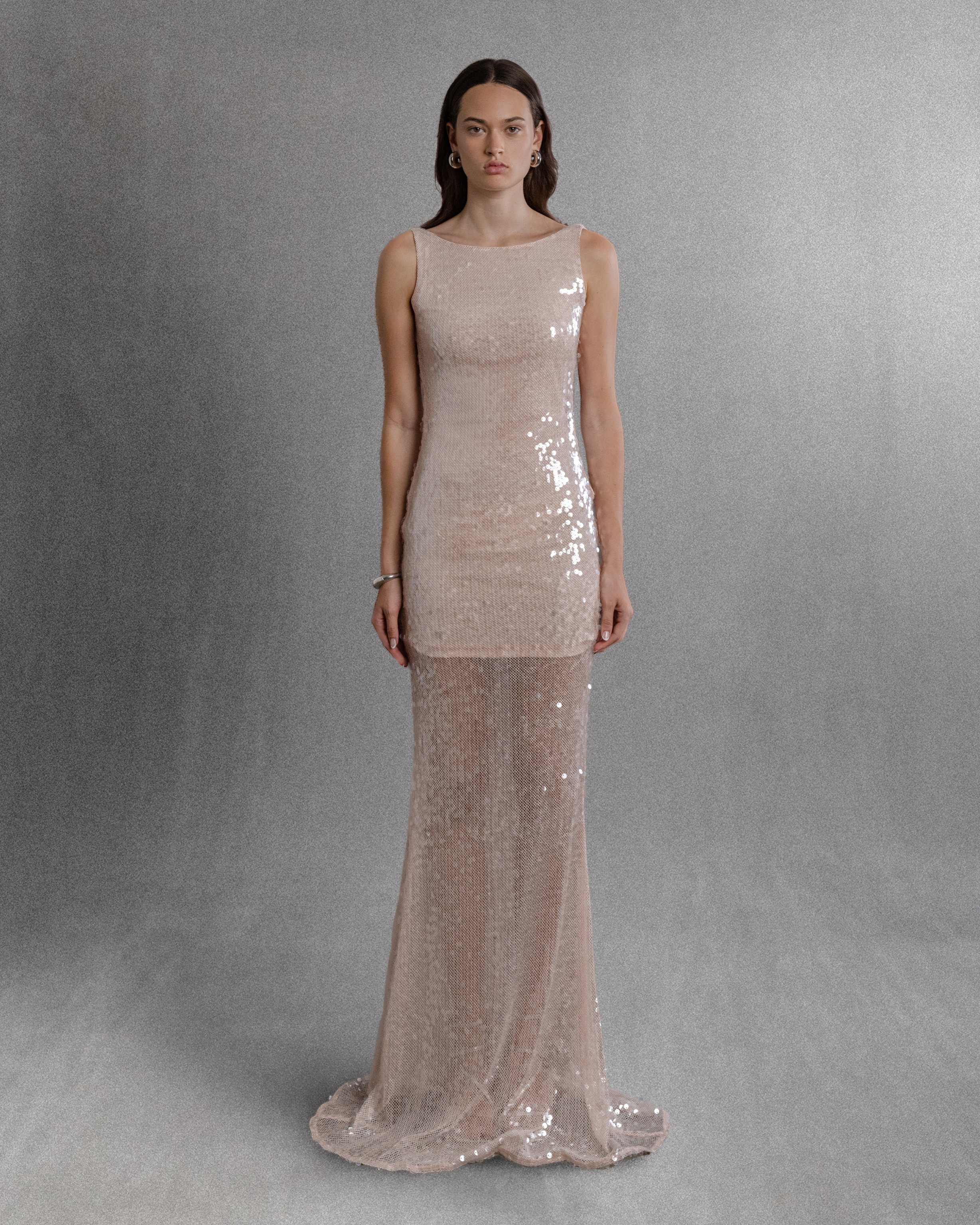 This nude sequin gown delivers soft glamour with a modern edge. Designed with a clean round neckline and a fitted silhouette, it features all-over sequin embellishment that transitions into a sheer panel below the thigh. The floor-length hem adds graceful movement, with a slight pooling effect for elevated drama. Perfect for formal events or contemporary bridal moments, this gown blends texture, shine, and fluidity in one refined look.