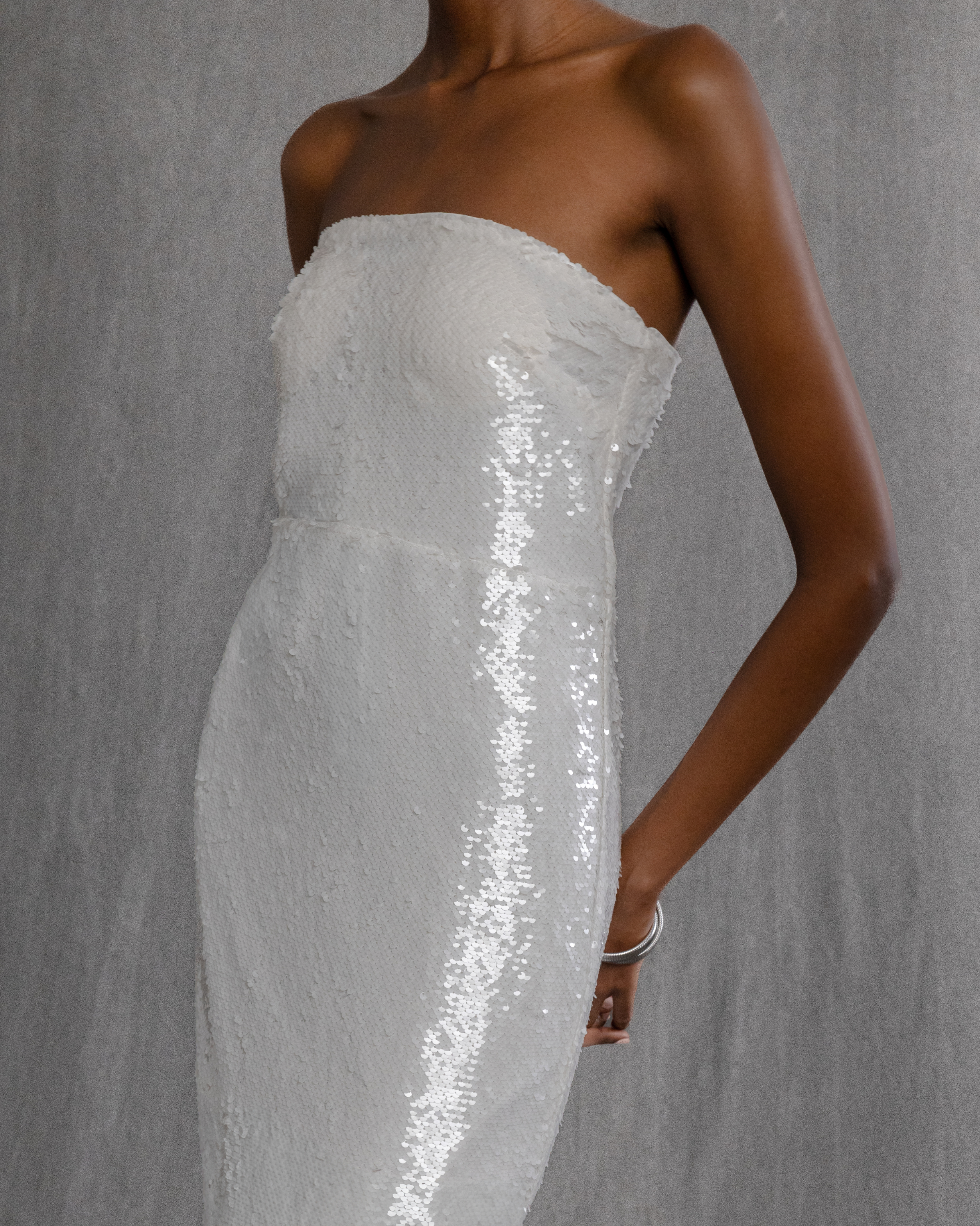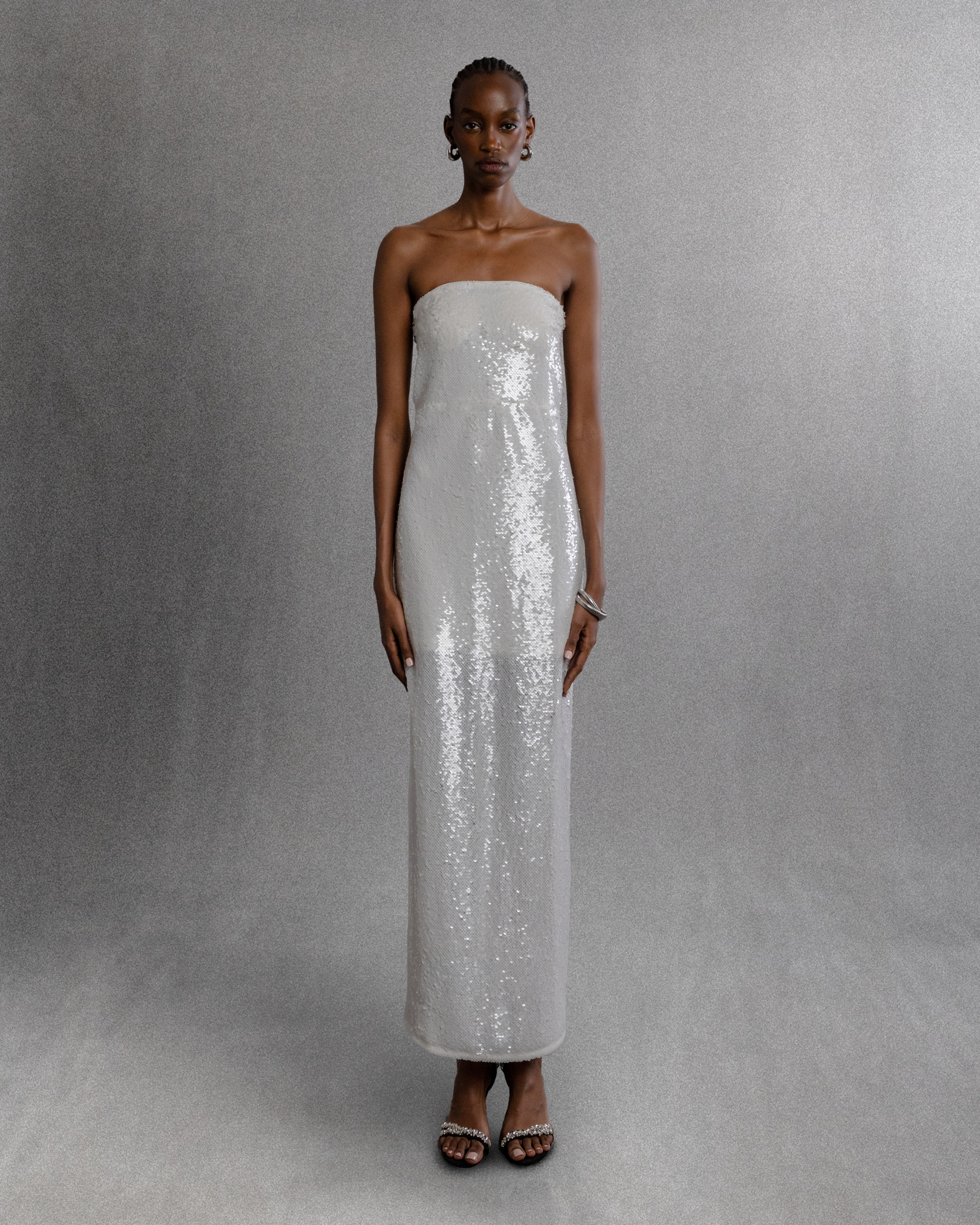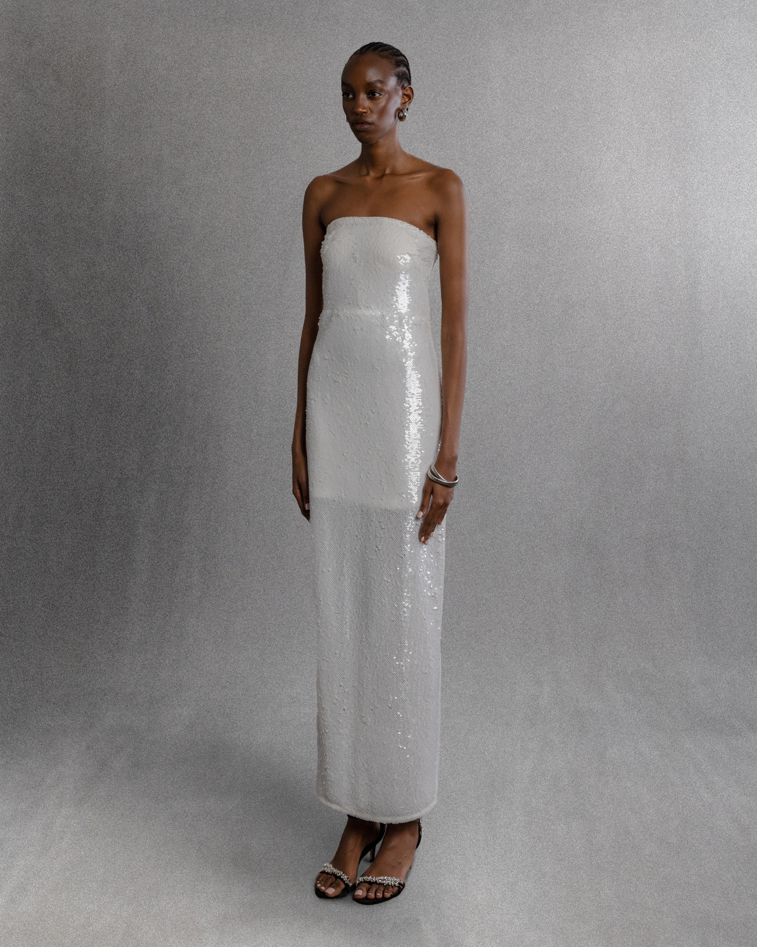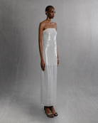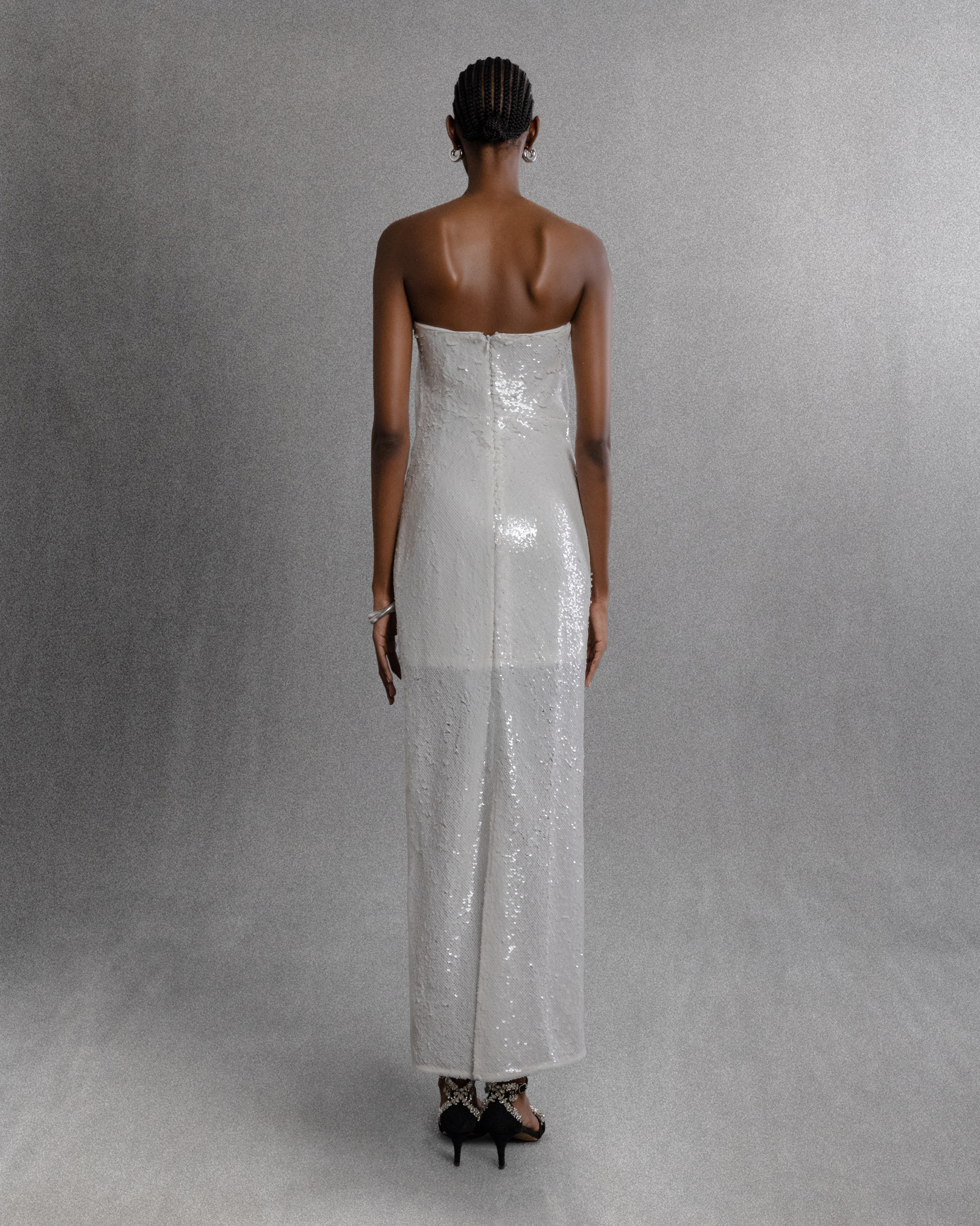 Minimalist meets glam in this sleek strapless column dress, fully embellished with luminous white sequins. The clean silhouette skims the body from a softly structured bust down to a gently tapered hem, creating a long, elegant line. Designed for formal events or modern bridal moments, this gown delivers understated sparkle with a timeless, statuesque feel.