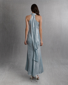 Turn heads in the ethereal Celeste Crisscross Gown, a floor-length statement piece crafted in lustrous wire-textured fabric with a subtle silk-touch sheen. This high-neck silhouette features a sophisticated crossover halter neckline and an elegant fit that gently skims the body, flattering every curve.