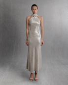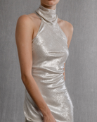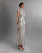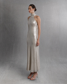Sleek and understated, this champagne gown features a high halter neckline and a gently contoured silhouette in a soft, silk-touch fabric with a refined metallic glow. A long, matching scarf tie flows from the back of the neck to the waist, creating elegant movement and visual length while maintaining a cohesive, tonal finish. Floor-length and subtly flared at the hem, this piece is ideal for minimalist eveningwear with a graceful twist.