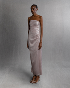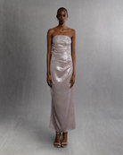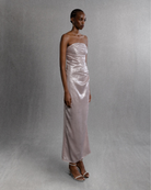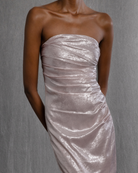 This strapless maxi dress is a stunning blend of sculptural elegance and feminine charm. The upper bodice features a uniquely pleated design, structured with wire to create a flattering, asymmetrical drape across the chest. The fabric has a subtle shimmer and soft, silk-touch finish that elevates the dress for evening occasions. Fitted through the waist and hips, the long skirt flows effortlessly to the ankles for a graceful silhouette that catches the light with every step.