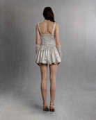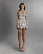 This shimmering champagne mini dress blends playful volume with sculptural shape. The soft shoulder straps frame a ruched bust, flowing into a cinched, contoured waist that defines the figure. Below, the gathered bubble-hem skirt adds movement and a touch of drama, perfect for cocktail parties and standout nights. The glossy, silk-touch fabric completes the look with an elegant sheen.