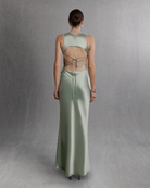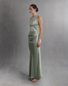 Graceful in a soft sage satin, this dress features elegant side draping around the hips for added texture and movement. The sleeveless design and high bateau neckline offer a clean and minimal silhouette, making it a sophisticated option for formal events.