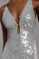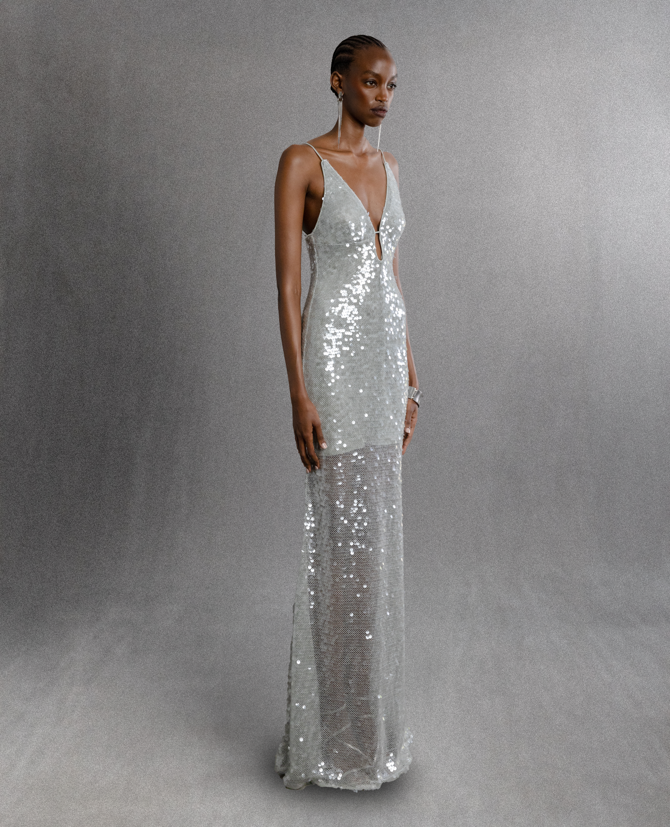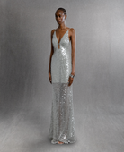 Striking and sophisticated, this sequin gown features a daring plunging neckline with a minimalist strap detail at the bust. Designed to contour the body, the gown flows into a floor-length silhouette that shimmers with every step. Thin shoulder straps and a smooth inner lining offer balance and comfort. Perfect for galas, black-tie evenings, or statement-making moments.
